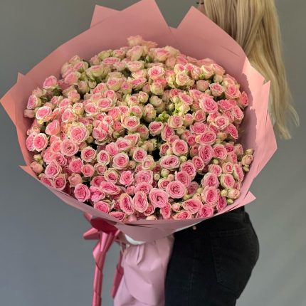 Цветы в большой коробке: садовые розы, лизиантус, маттиола, тюльпаны
