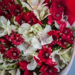 Букет из 15 красных гвоздик и 10 красных альстромерий