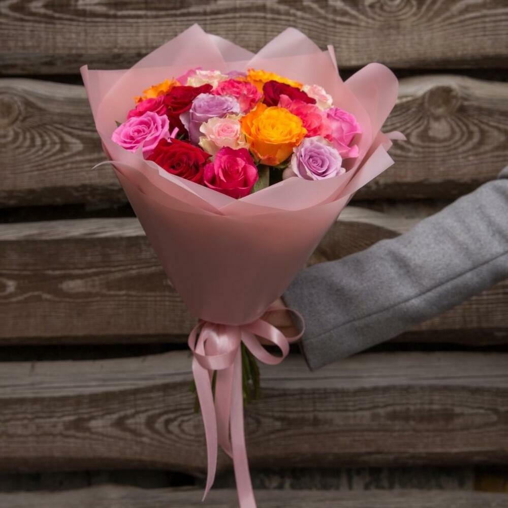 Multicoloured roses in stylish matte wrap film. Recipients will definitely appreciate these long-lasting roses.