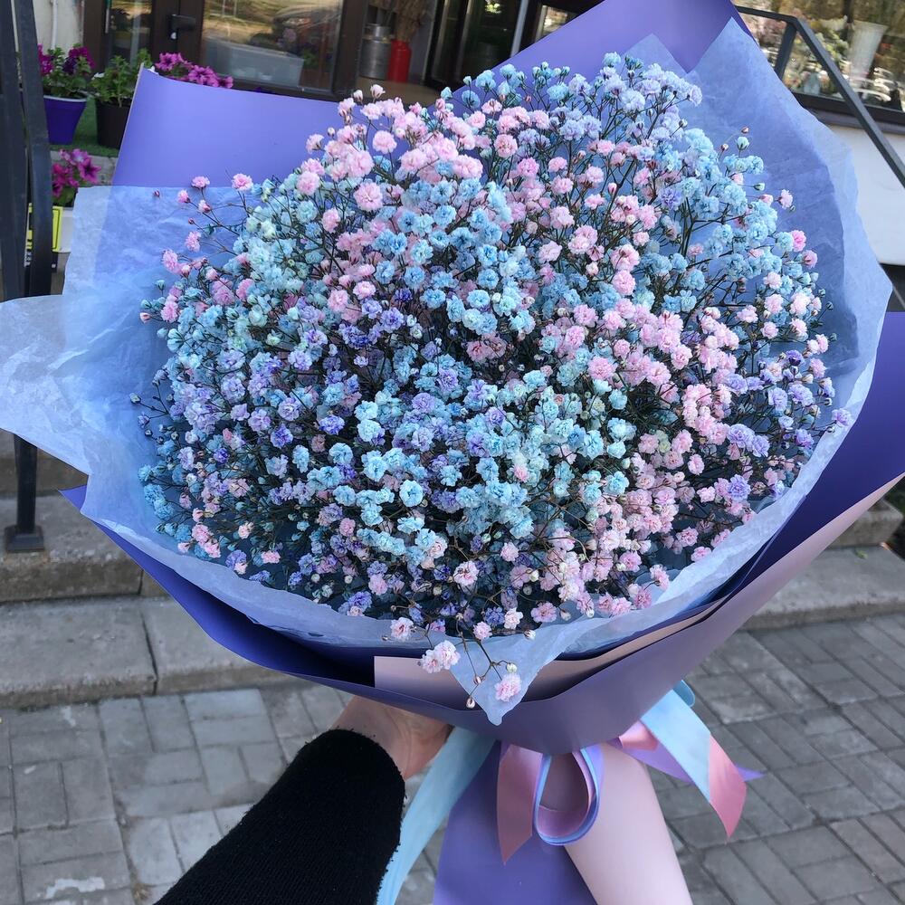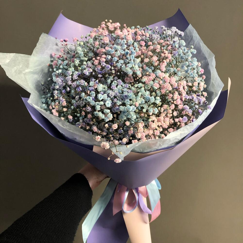 Лента атласная – 3 шт.Тишью – 2 шт.гипсофила цветная – 5 шт.пленка матовая градиент – 5 шт.