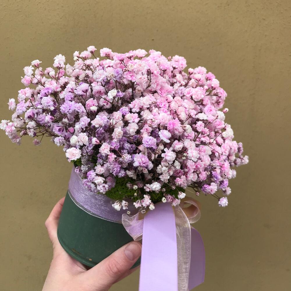 “Сиреневый туман” – композиция из гипсофилы в шляпной коробке