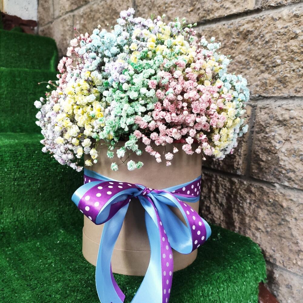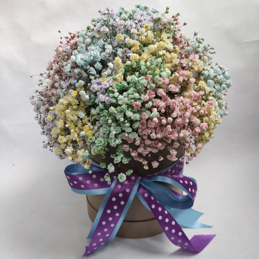 гипсофила микс – 15 шт.Оазис флористический – 1 шт.коробка картонная круглая – 1 шт.