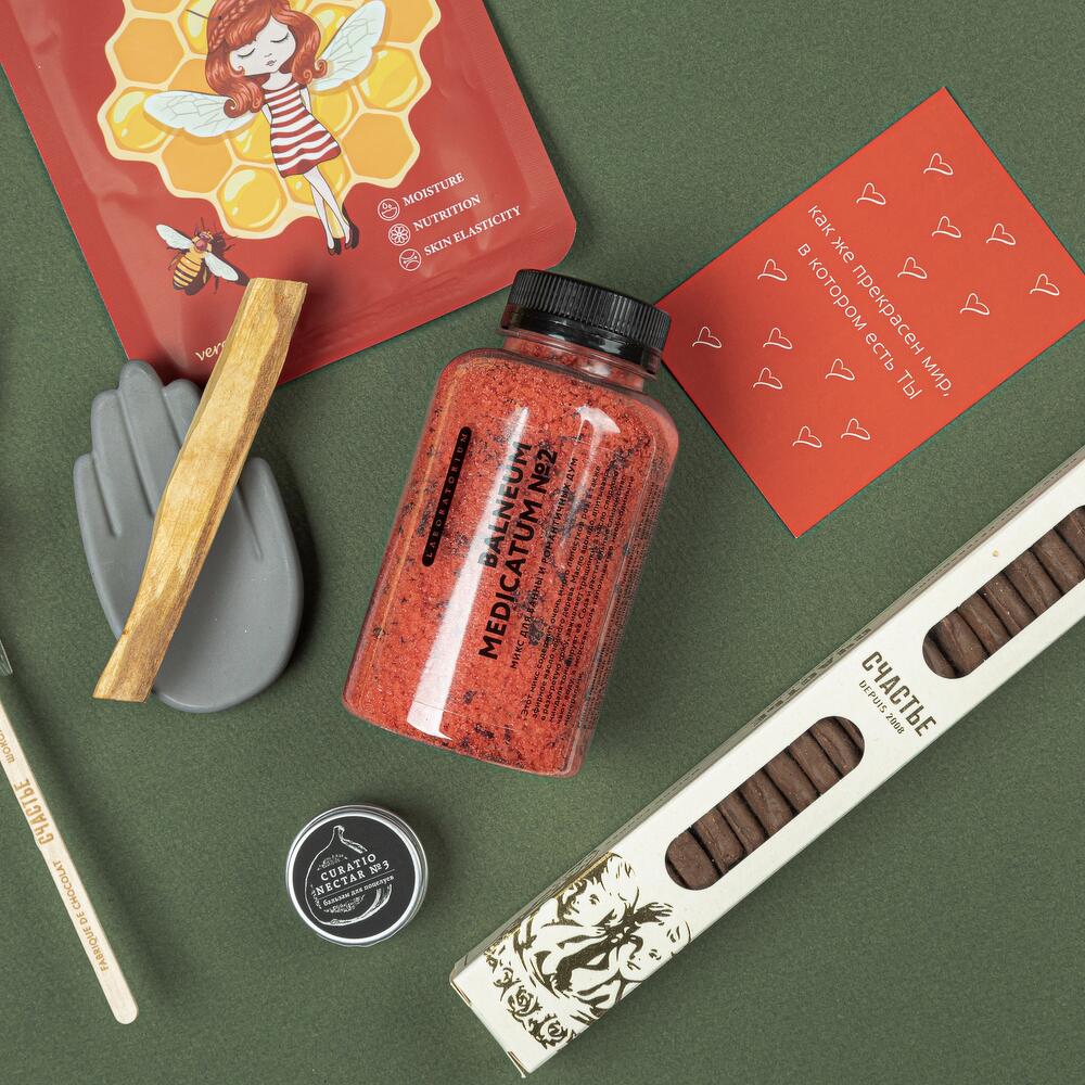 соль для ванной laboratorium – 1 шт.ириски “счастье” – 1 шт.благовоние пало санто – 1 шт.подставка-ладошка для благовоний из гипсофила – 1 шт.бальзам для губ laboratorium – 1 шт.ангел “счастье” – 1 шт.маска тканевая для лица – 1 шт.