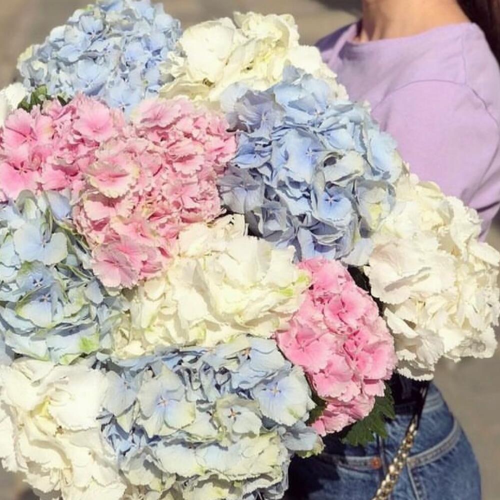 ассорти гортензий – 13 шт.Лента атласная – 2 шт.Открытка – 1 шт.инструкция по уходу за цветами – 1 шт.хорошее настроение – 100 шт.коробка переноска – 1 шт.Кризал – 1 шт.