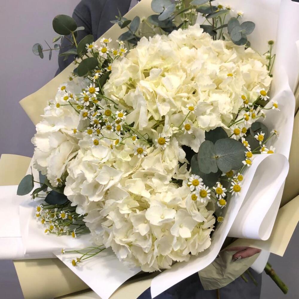Гортензия – 3 шт.Матрикария – 6 шт.Эвкалипт – 3 шт.Корейская упаковка – 2 шт.бант атласный – 1 шт.