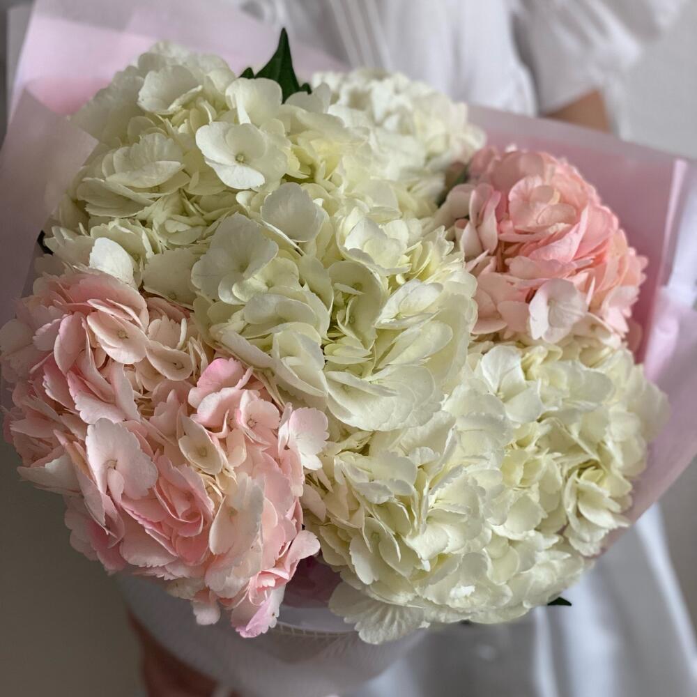 Лента атласная – 1 шт.Упаковка дизайнерская – 4 шт.Гортензия микс – 5 шт.