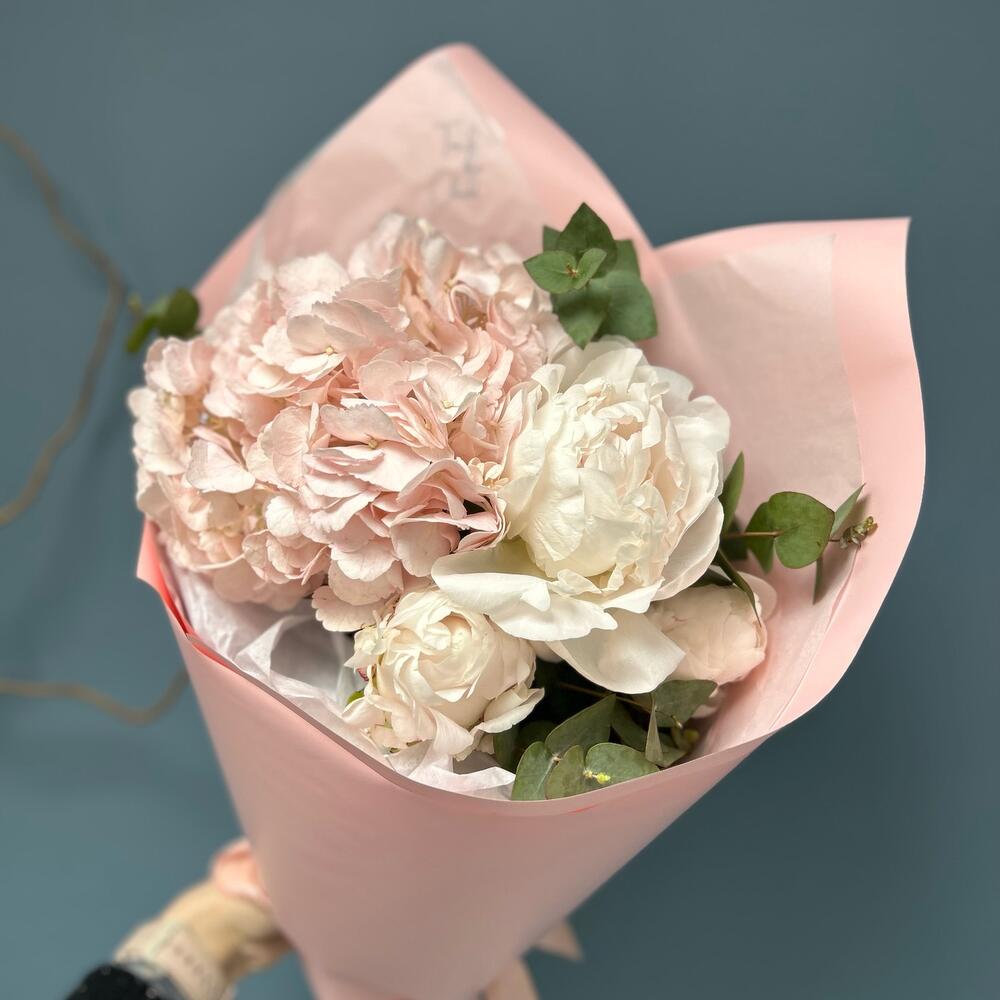 Розовая гортензия и нежные пионы с эвкалиптом в розовой упаковке