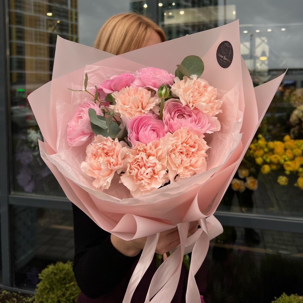 Ранункулюс – 5 шт.диантусы – 5 шт.Эвкалипт – 2 шт.декоративная упаковка – 1 шт.Атласная лента – 1 шт.
