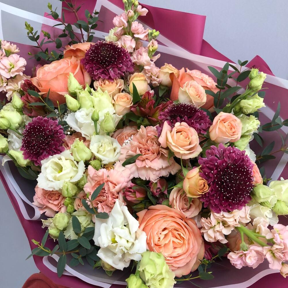Альстромерия – 4 шт.Лизиантус – 4 шт.Маттиола – 4 шт.Озотамнус – 3 шт.Роза кустовая – 3 шт.Скабиоза – 4 шт.Эвкалипт – 4 шт.Роза – 5 шт.Гвоздика – 7 шт.Лента атласная – 1 шт.Упаковка дизайнерская – 1 шт.