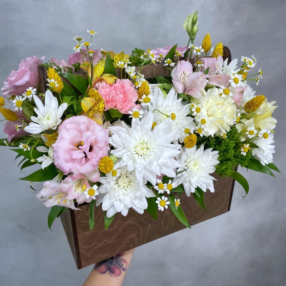 “Атлас☁️” – цветочная композиция с зефиром в деревянном ящике