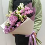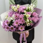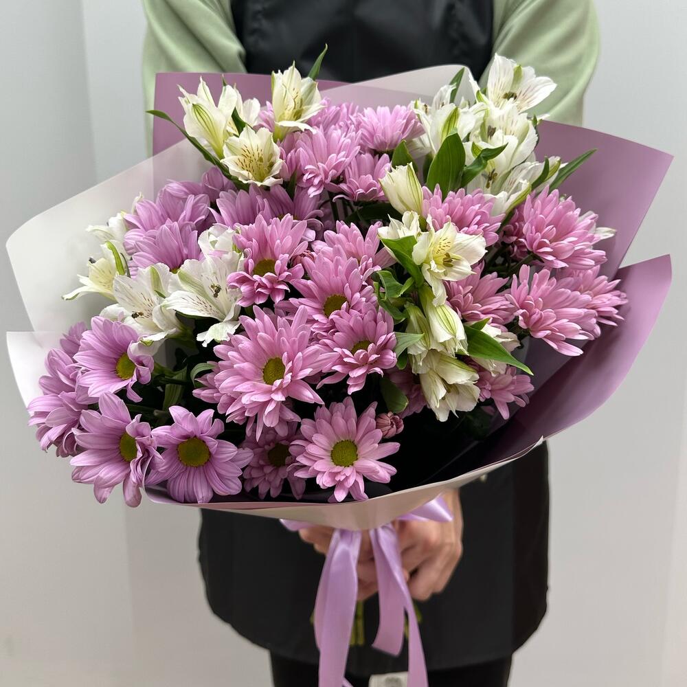 Альстромерия – 4 шт.Лента атласная – 1 шт.Упаковка дизайнерская – 1 шт.Хризантема кустовая цветная – 5 шт.
