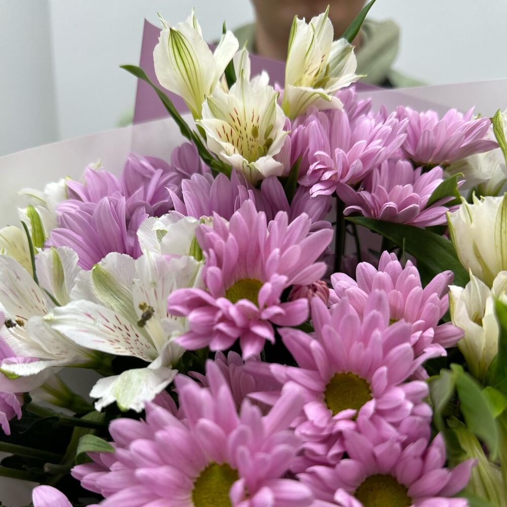 Букет розовая хризантема и белая альстромерии