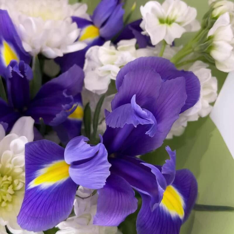 Маттиола – 2 шт.Хризантема кустовая – 1 шт.Матрикария – 1 шт.Фисташка – 2 шт.Упаковка дизайнерская – 1 шт.Берграсс пучок – 1 шт.ирисы – 7 шт.