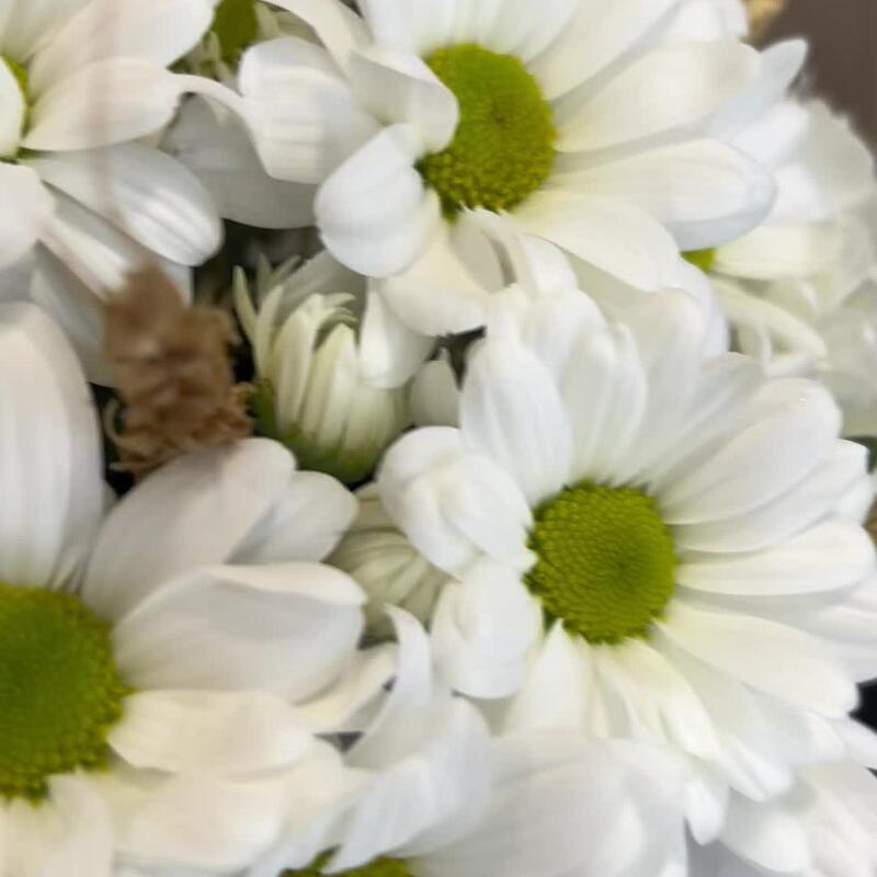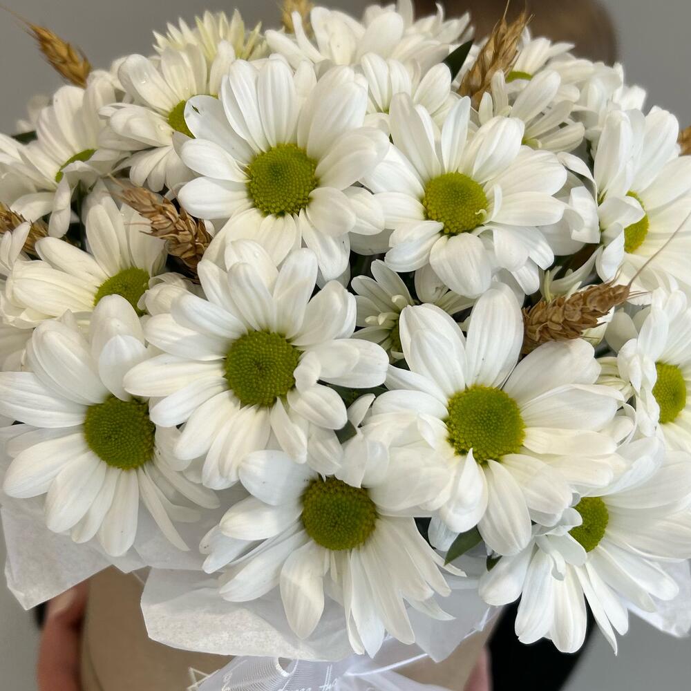 Композиция в коробке из белой кустовой хризантемы и веточек пшеницы