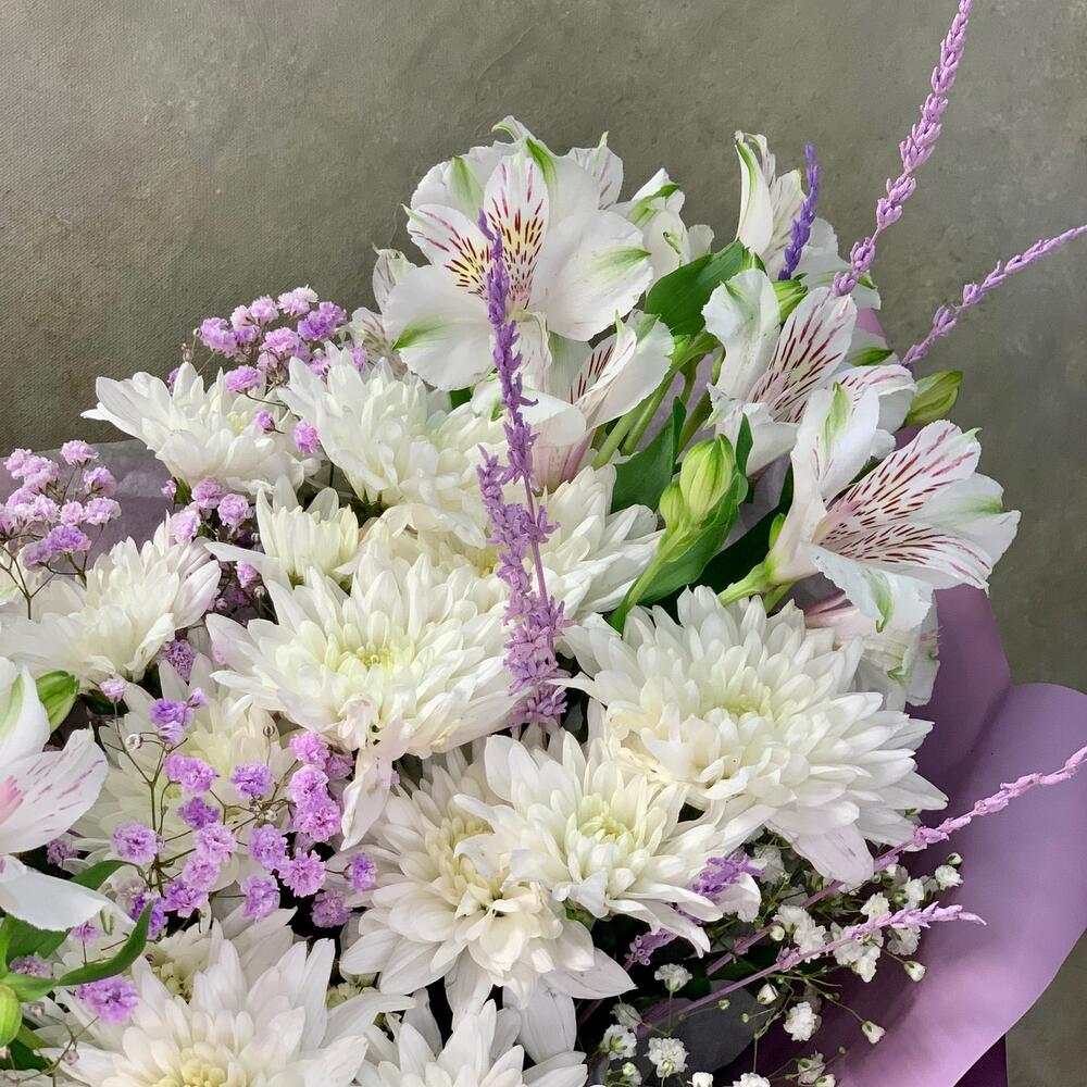 «Лавандовое созвездие» Букет из розы, гвоздики, статица и хлопка