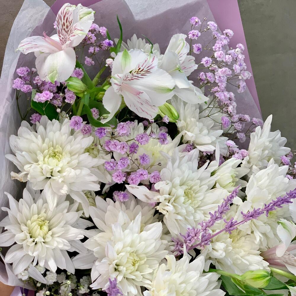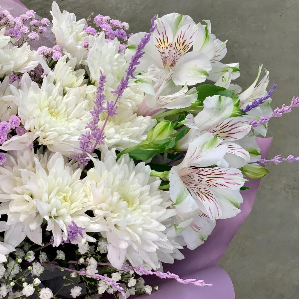 Альстромерии, Гвоздики, Кустовые розы, Лизиантусы, Розы, Хризантемы