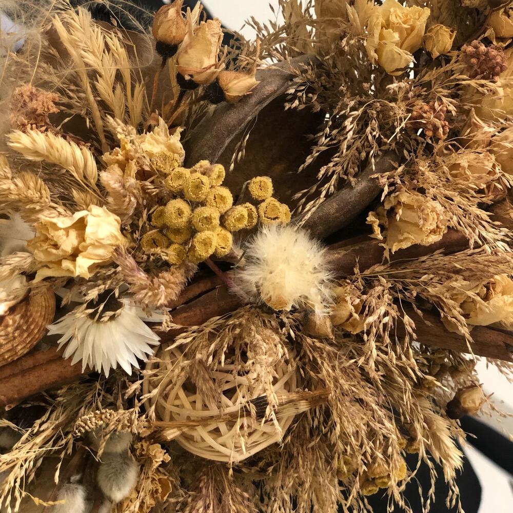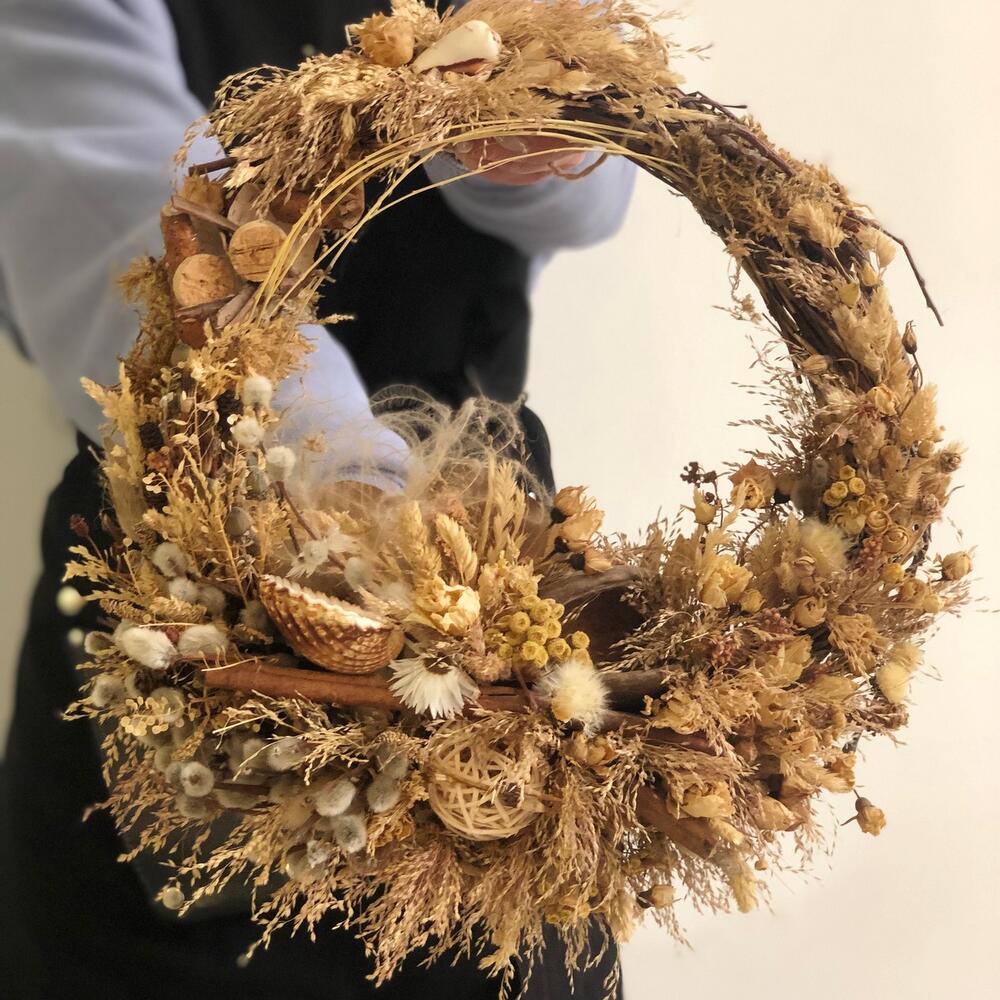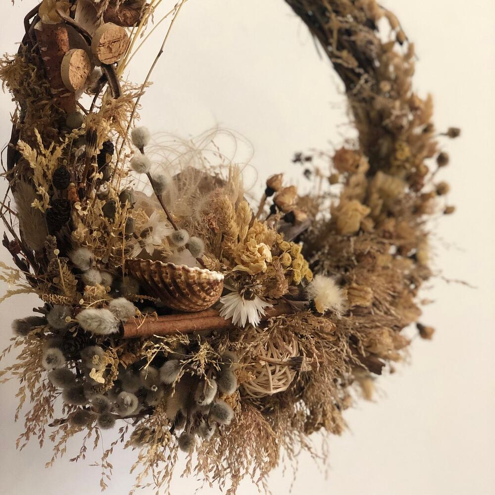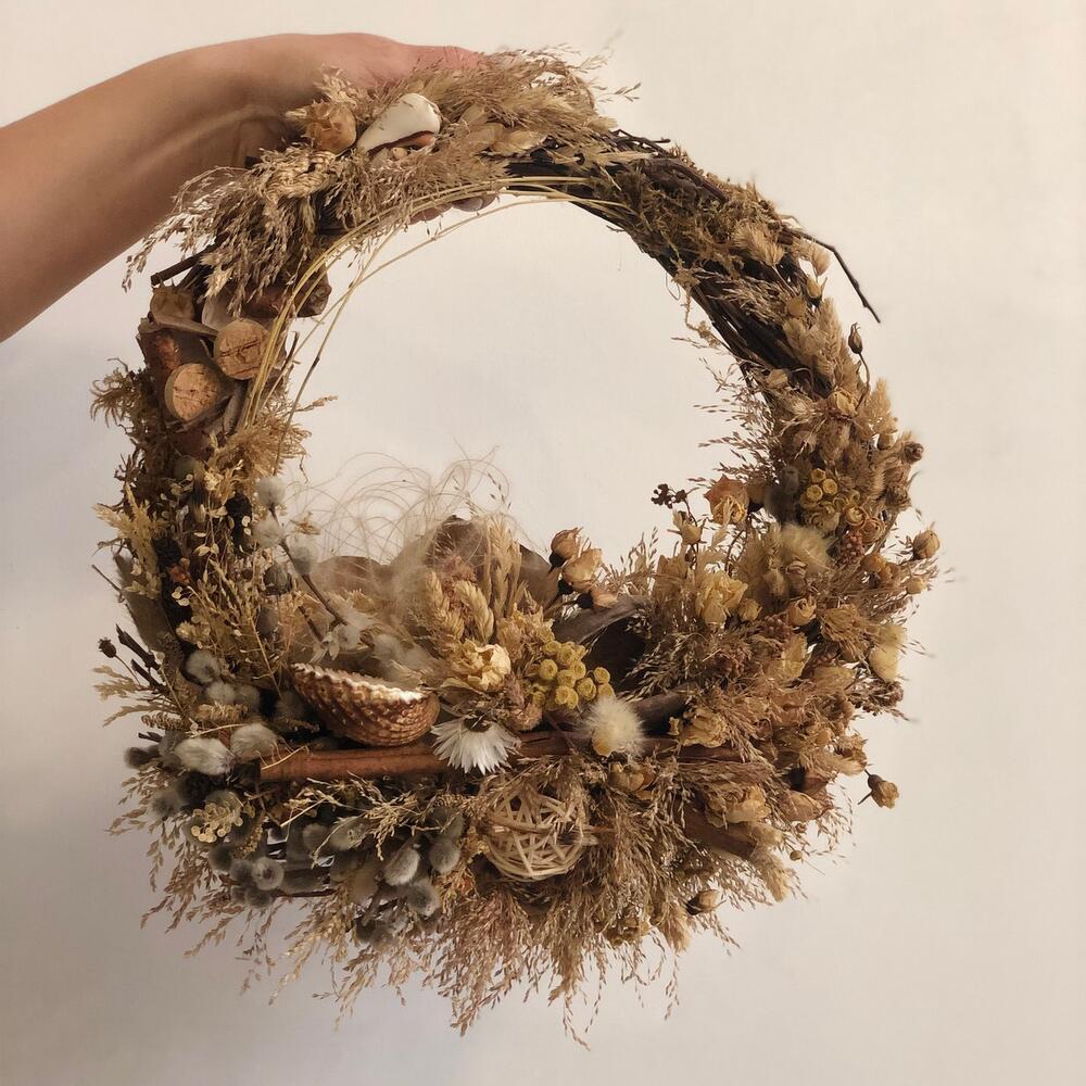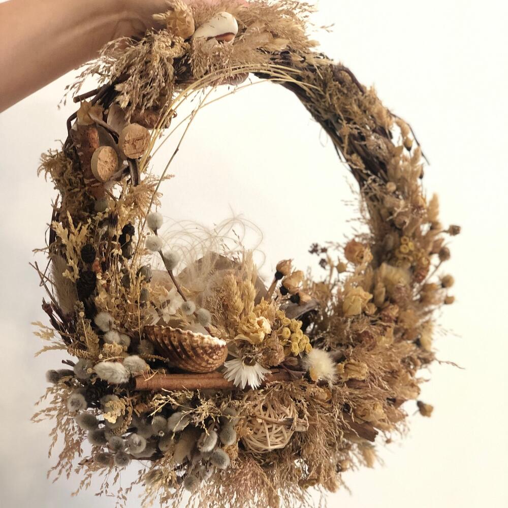 букет из сухоцветов микс – 10 шт.Основа для венка – 1 шт.верба пучок – 3 шт.ракушки декор – 1 шт.Шар ротанг – 1 шт.Палочки корицы – 5 шт.гелихризум (сухоцвет) – 5 шт.