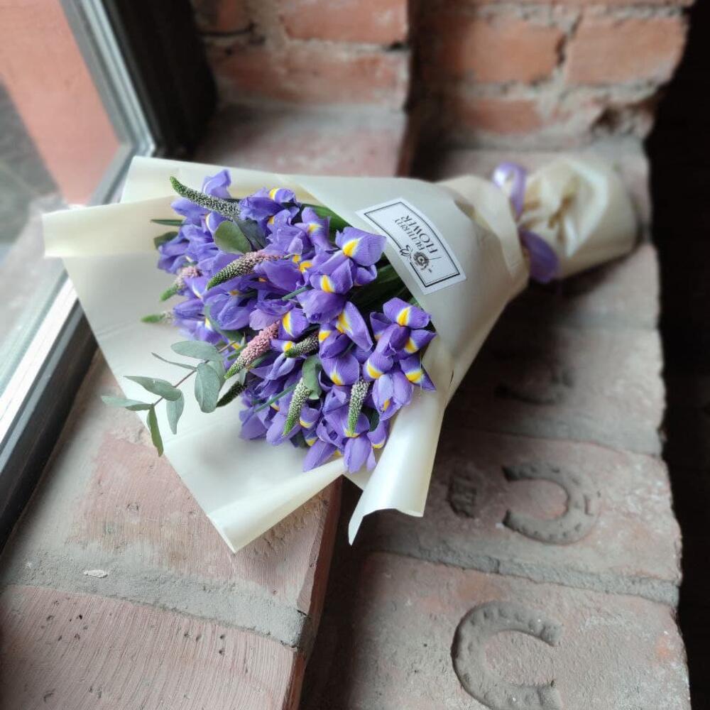 Ирис – 25 шт.Вероника – 9 шт.Эвкалипт – 1 шт.Упаковка – 1 шт.