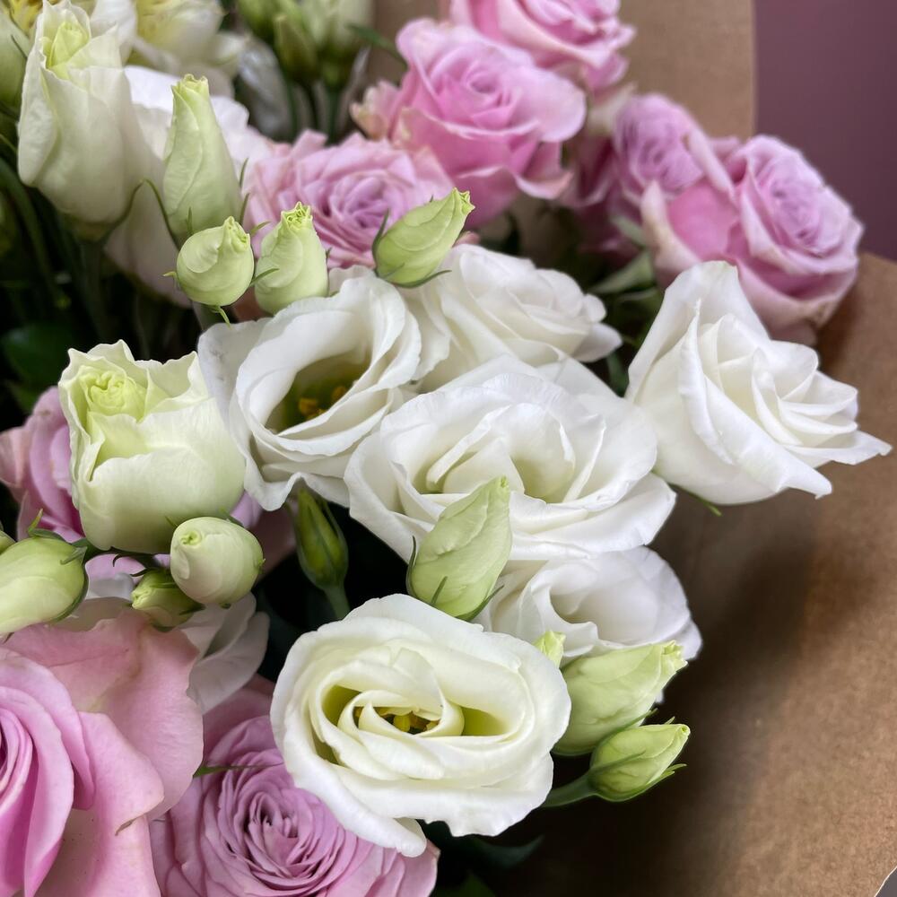 Роза кустовая – 9 шт.эустома белая – 5 шт.Альстромерия – 5 шт.Крафт упаковка – 5 шт.