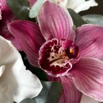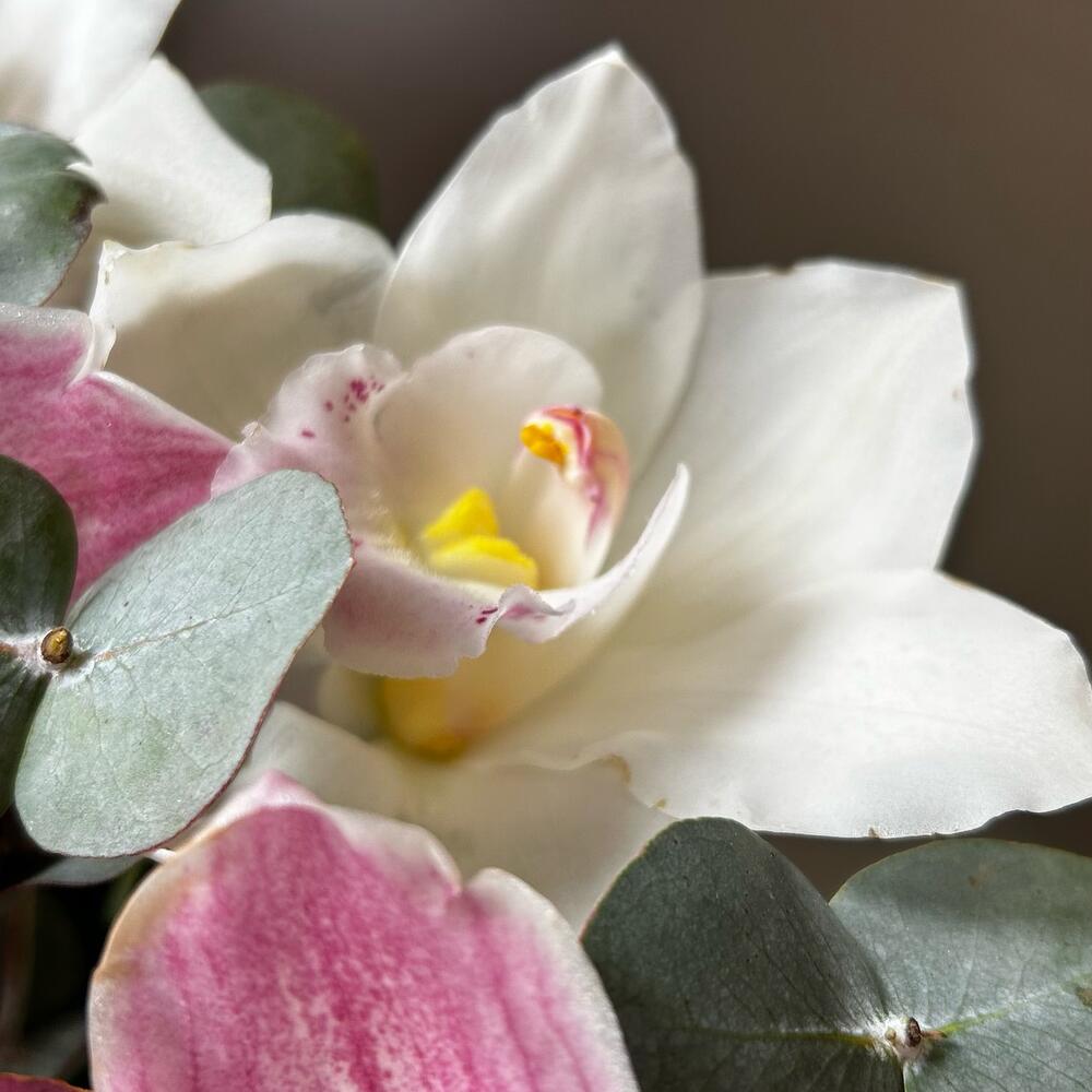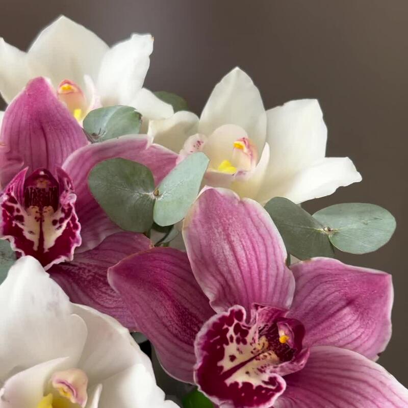 Коробка шляпная – 1 шт.Пиафлор (оазис) – 1 шт.Упаковка дизайнерская – 2 шт.Эвкалипт – 3 шт.Орхидея Цимбидиум – 7 шт.