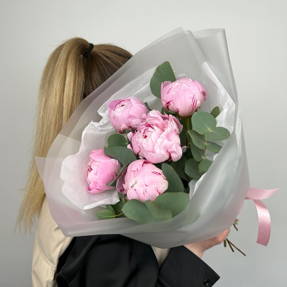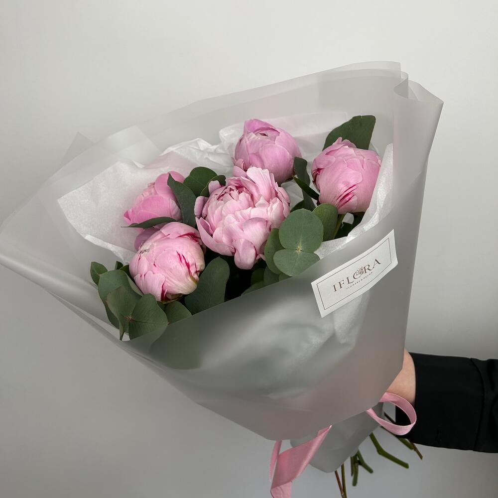 Нежно-розовые пионы 5 шт с эвкалиптом в дизайнерской упаковке – отличный комплимент любой девушкеК букету в качестве подарка подкрепим кризал, инструкцию по уходу за цветами и шоколадку!