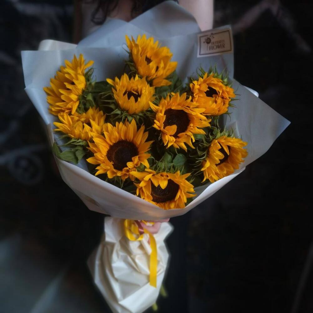 Букет из 9 подсолнухов в стильной упаковке “Прометей”