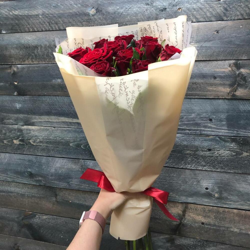 Лента – 1 шт.Упаковка – 1 шт.Роза красная 60 см – 11 шт.