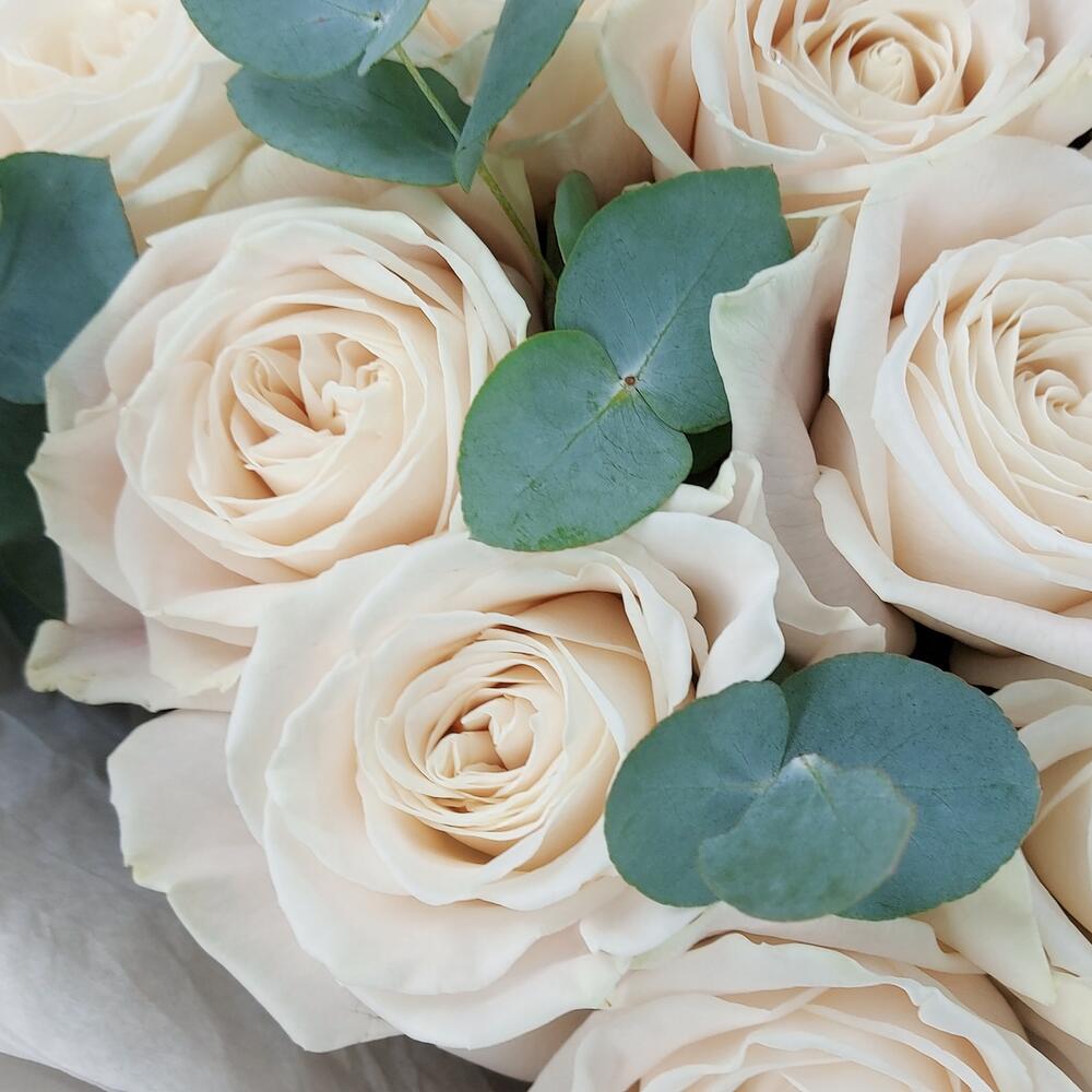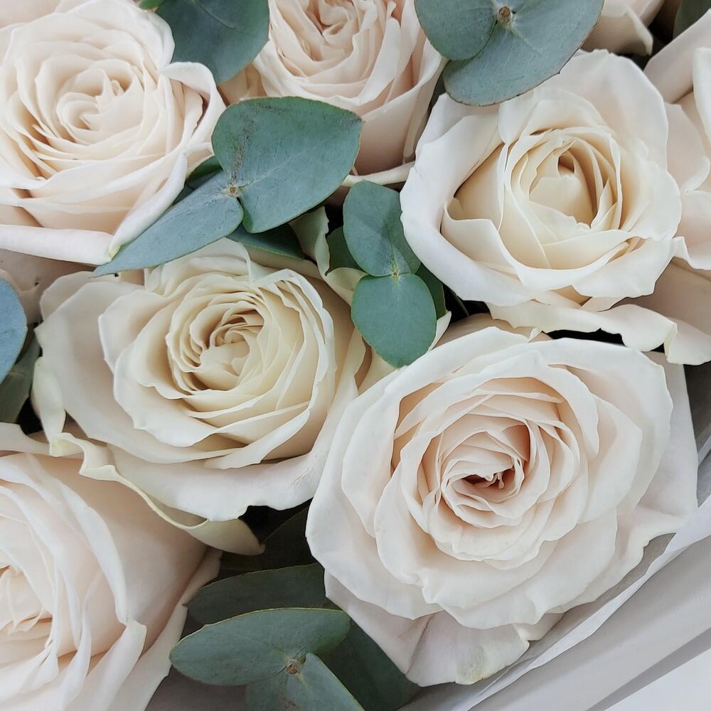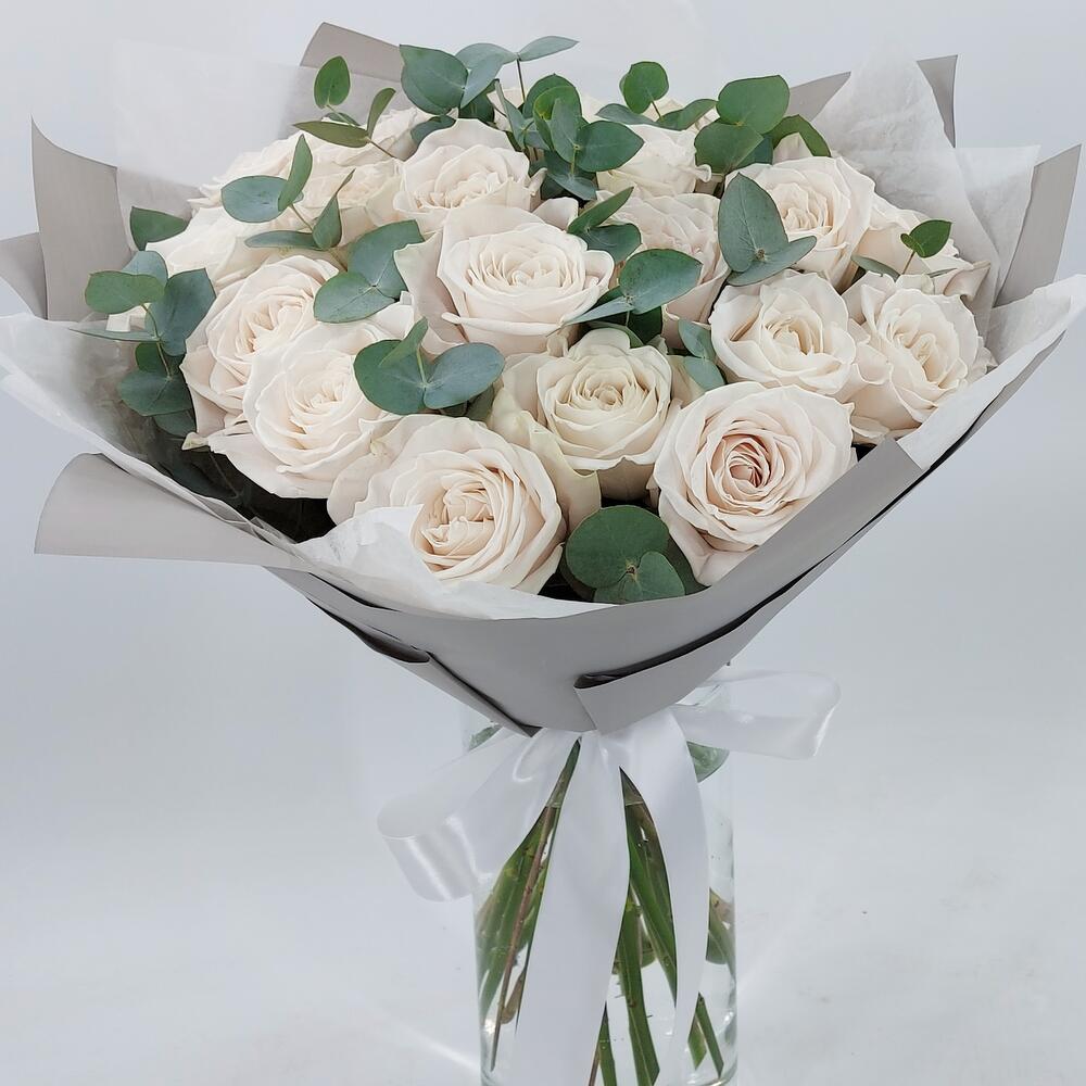 Роза Эквадор Премиум – 21 шт.эвкалипт цинерея пучок – 1 шт.Упаковка дизайнерская – 1 шт.