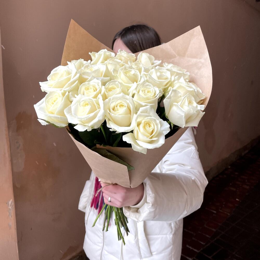Крафт упаковка – 1 шт.Роза россия белая – 21 шт.