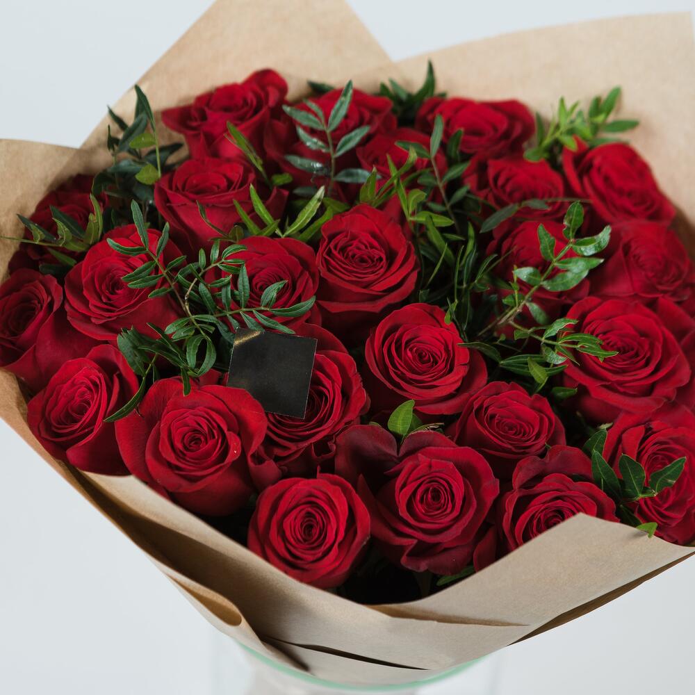 25 роз explorer PREMIUM 50 см в крафте с зеленью