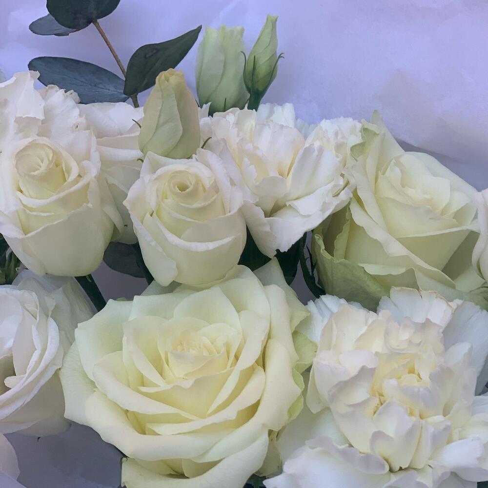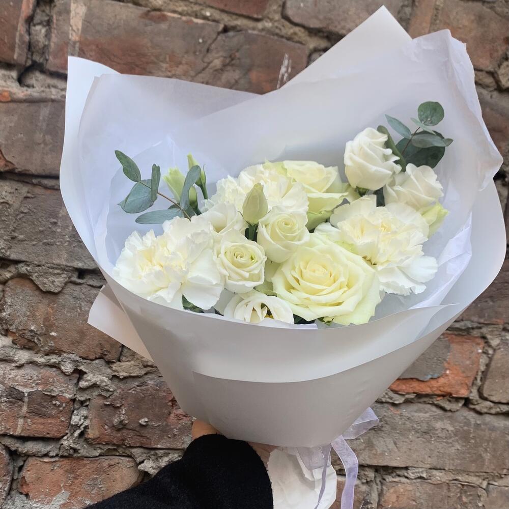 Лизиантус – 1 шт.Роза – 2 шт.Гвоздика – 3 шт.Упаковка дизайнерская – 1 шт.