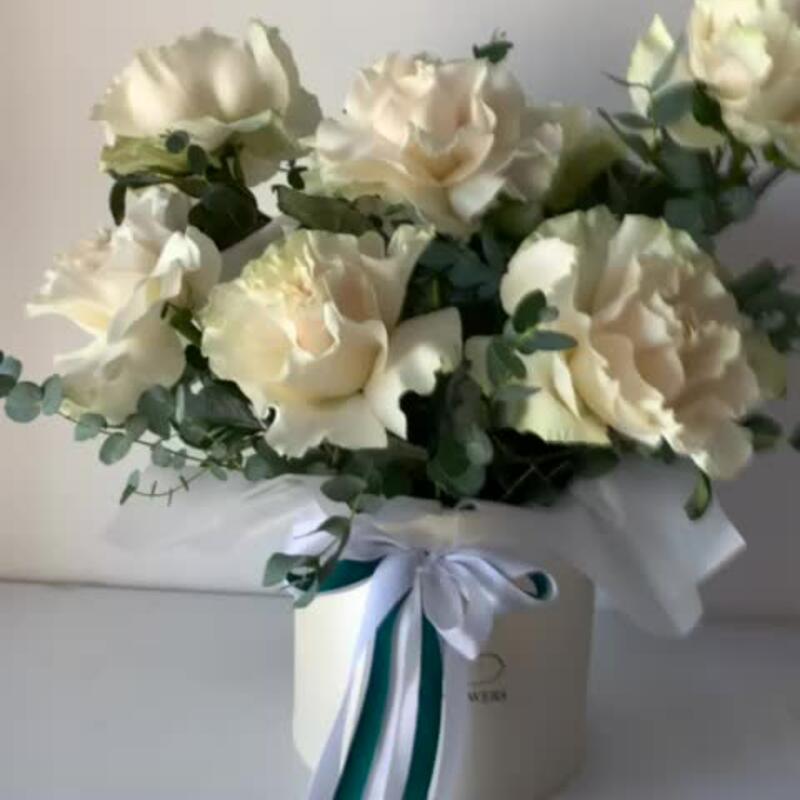 Эвкалипт – 6 шт.Коробка – 1 шт.Роза французская – 7 шт.Оазис флористический – 1 шт.