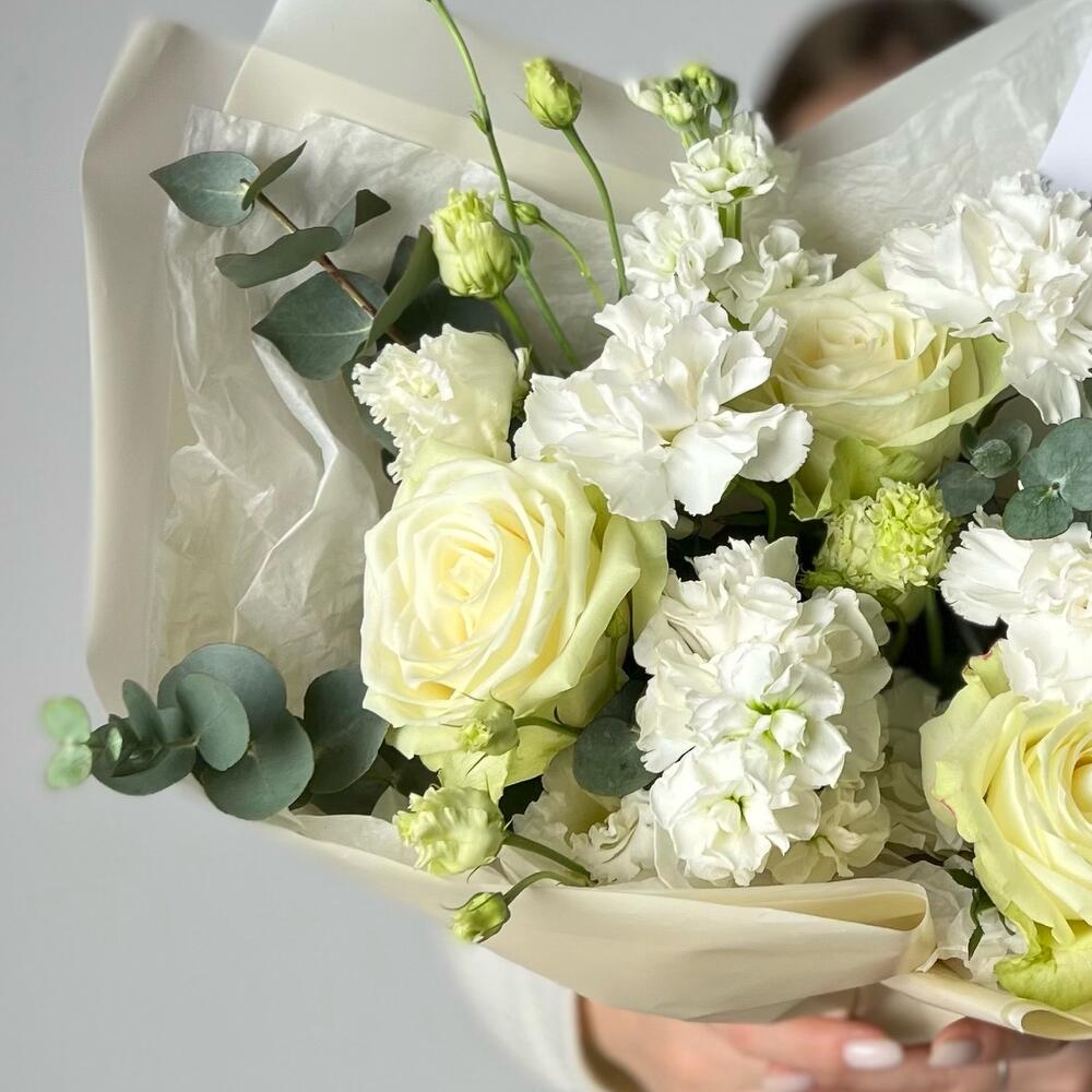 Одноголовая роза – 3 шт.Гвоздика – 3 шт.Эвкалипт – 1 шт.Маттиола – 3 шт.Эустома – 2 шт.Упаковка дизайнерская – 3 шт.Лента атласная – 1 шт.подкормка для срезанных цветов – 1 шт.Открыточка с вашими пожеланиями – 1 шт.