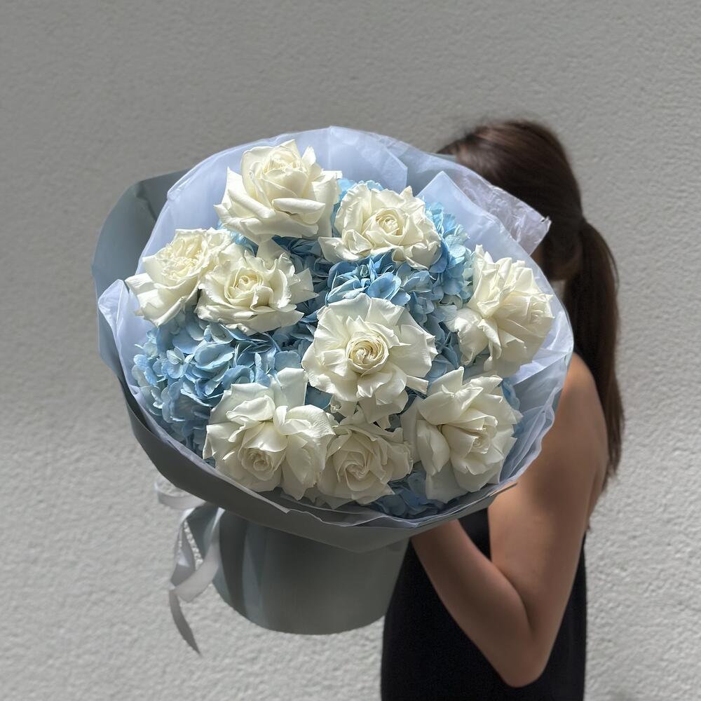 Нежный, волнующий и ароматный букет с гортензией и белыми розами.
