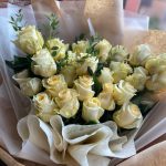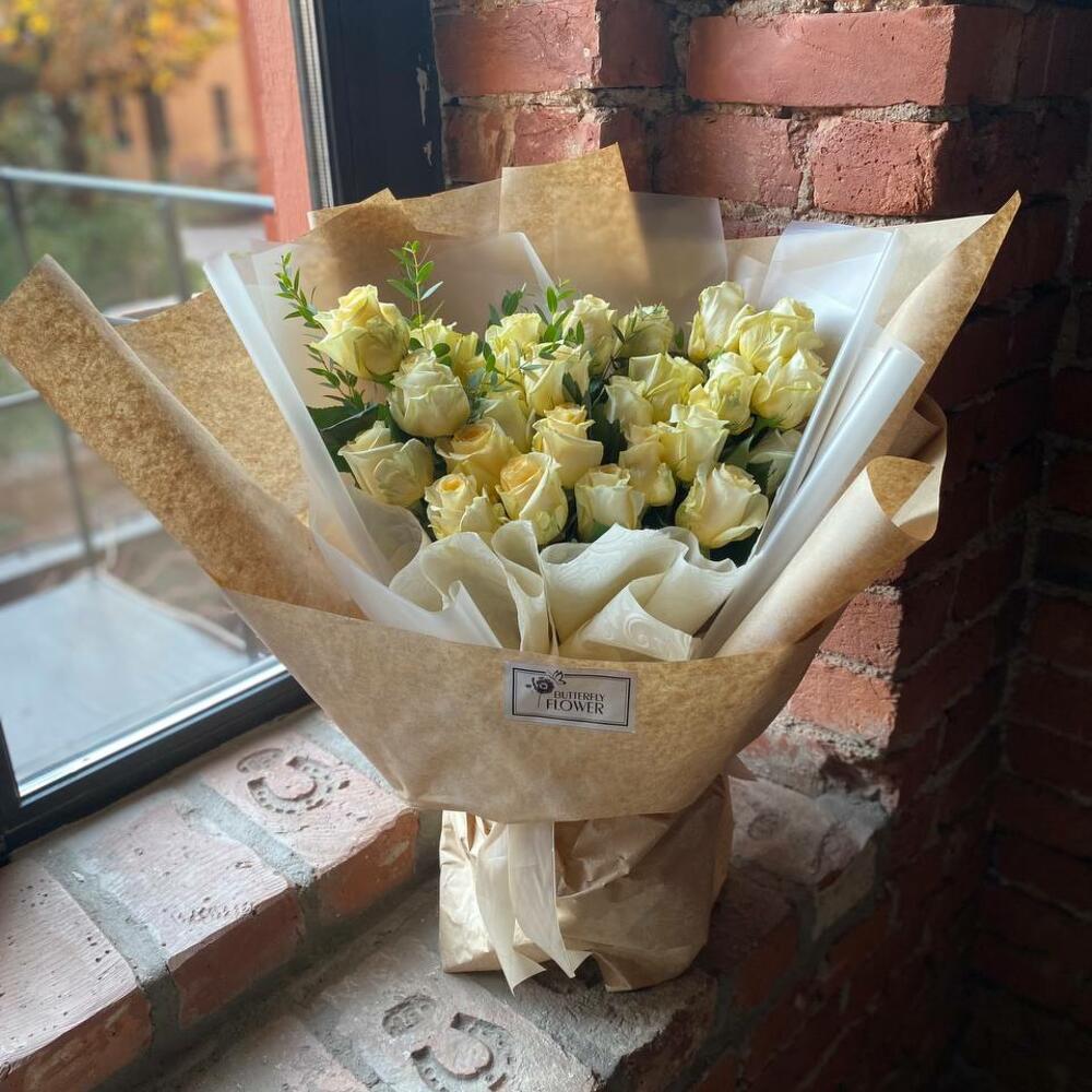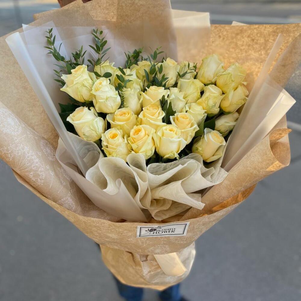 Букет из 25 белых роз и эвкалипта в крафтовой упаковке “Северный полюс”