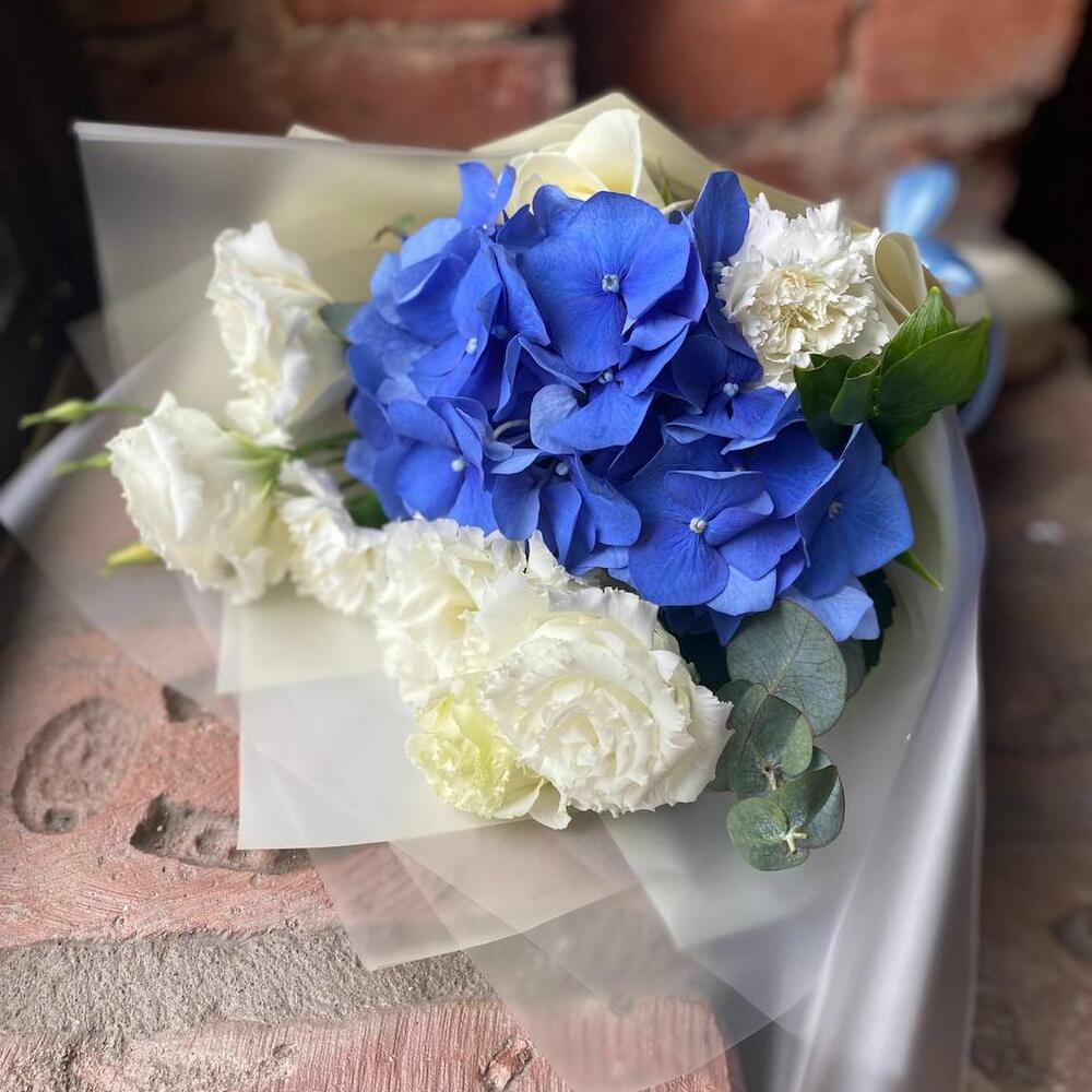 Гортензия – 1 шт.Роза белая – 1 шт.Гвоздика – 2 шт.Эустома – 2 шт.Эвкалипт – 2 шт.Упаковка – 2 шт.