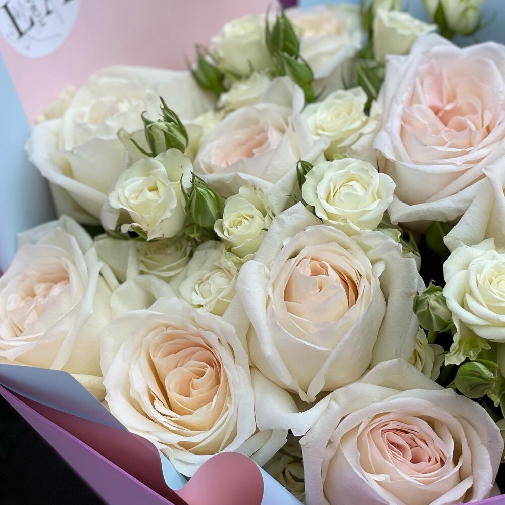 Роза кустовая – 4 шт.Упаковка дизайнерская – 4 шт.лента фирменная – 2 шт.Фоамиран (упаковка) – 1 шт.white o’hara пионовидная роза – 9 шт.
