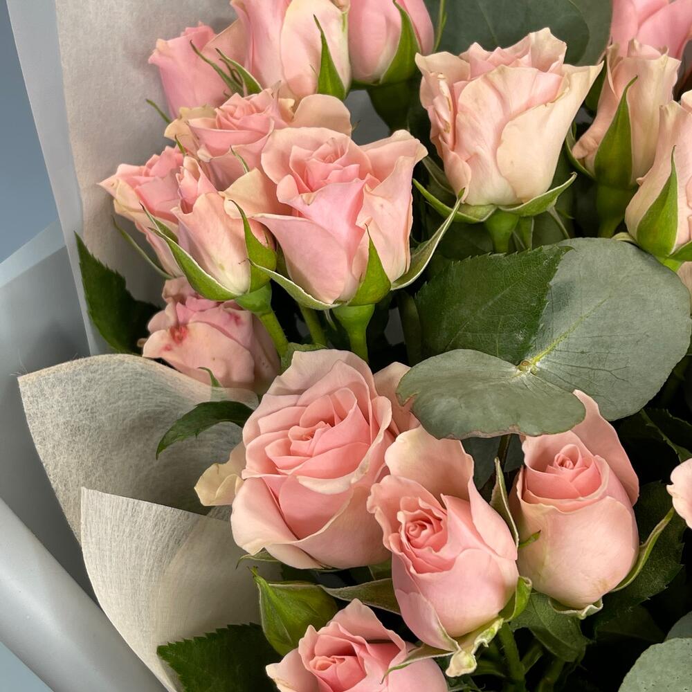Лента – 2 шт.Роза кустовая – 7 шт.Эвкалипт – 1 шт.Упаковка – 1 шт.Фисташка – 2 шт.