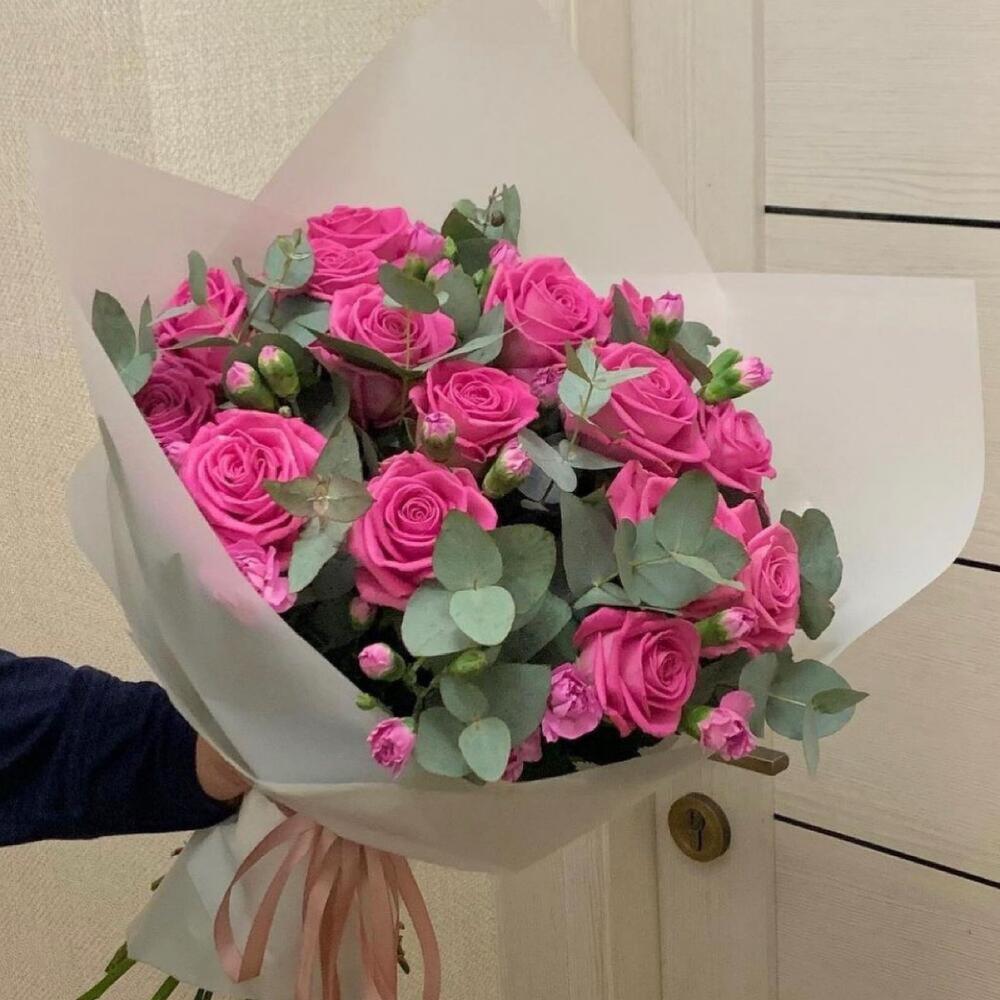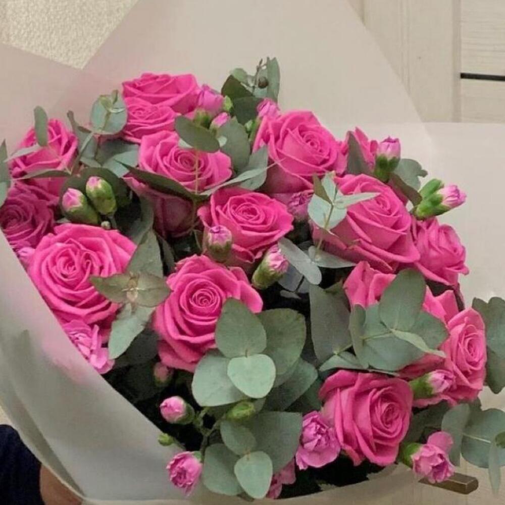 Роза розовая – 19 шт.Эвкалипт – 10 шт.Упаковка дизайнерская – 1 шт.Лента атласная – 2 шт.Открыточка с вашими пожеланиями – 1 шт.хорошее настроение – 100 шт.инструкция по уходу за цветами – 1 шт.коробка переноска – 1 шт.Кризал – 1 шт.