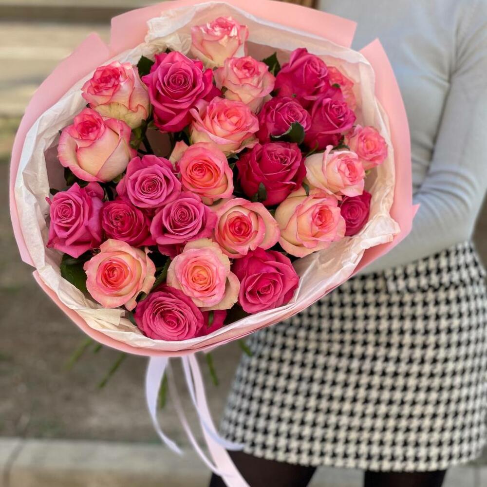 Шикарный микс из двух видов розовой розы. Свежесть цветов Вас приятно удивит. Заказывайте с доставкой по Тбилиси.