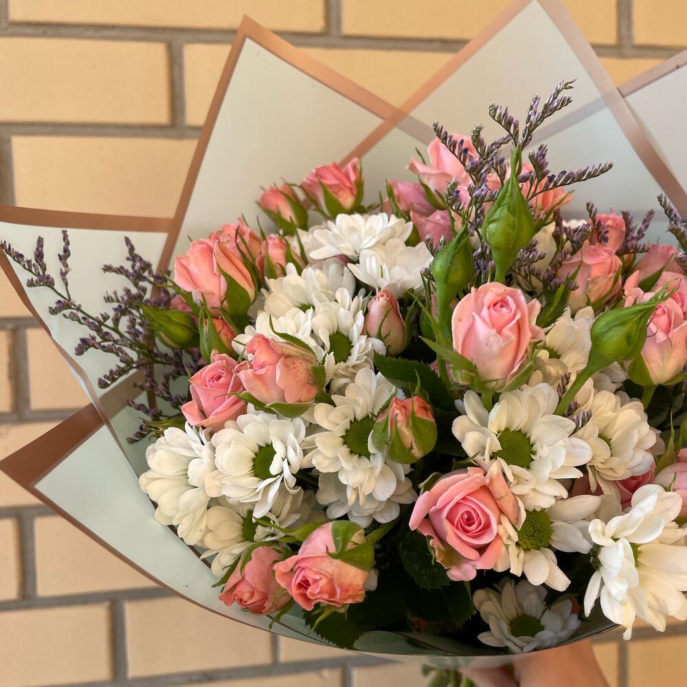 Роза кустовая – 7 шт.Хризантема кустовая – 6 шт.Лимониум – 3 шт.Упаковка дизайнерская – 3 шт.
