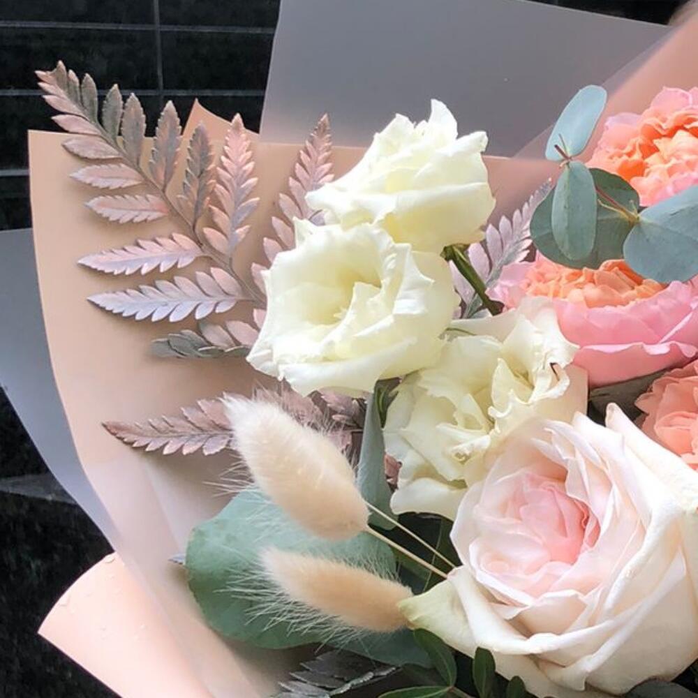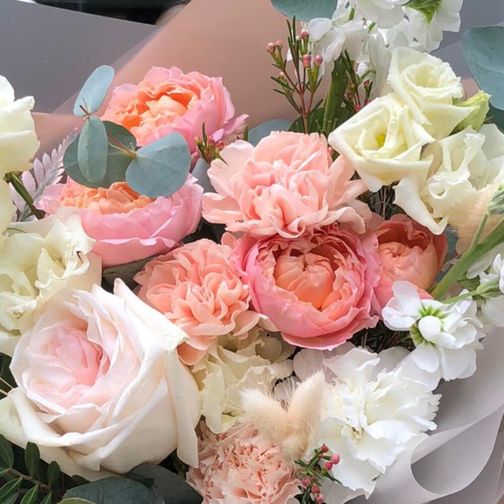 Роза кустовая джульетта – 1 шт.Маттиола белая – 2 шт.Лизиантус Алиса белый – 2 шт.Эвкалипт – 1 шт.Диантус – 3 шт.