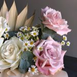 роза faith премиум – 3 шт.роза playa blanca премиум – 2 шт.матрикария (голландская ромашка) пучок – 2 шт.пальма веерная – 1 шт.Гвоздика – 3 шт.эвкалипт cineria пучок – 1 шт.ветка вербы натуральная – 1 шт.Шляпная коробка – 1 шт.губка флористическая oasis – 1 шт.