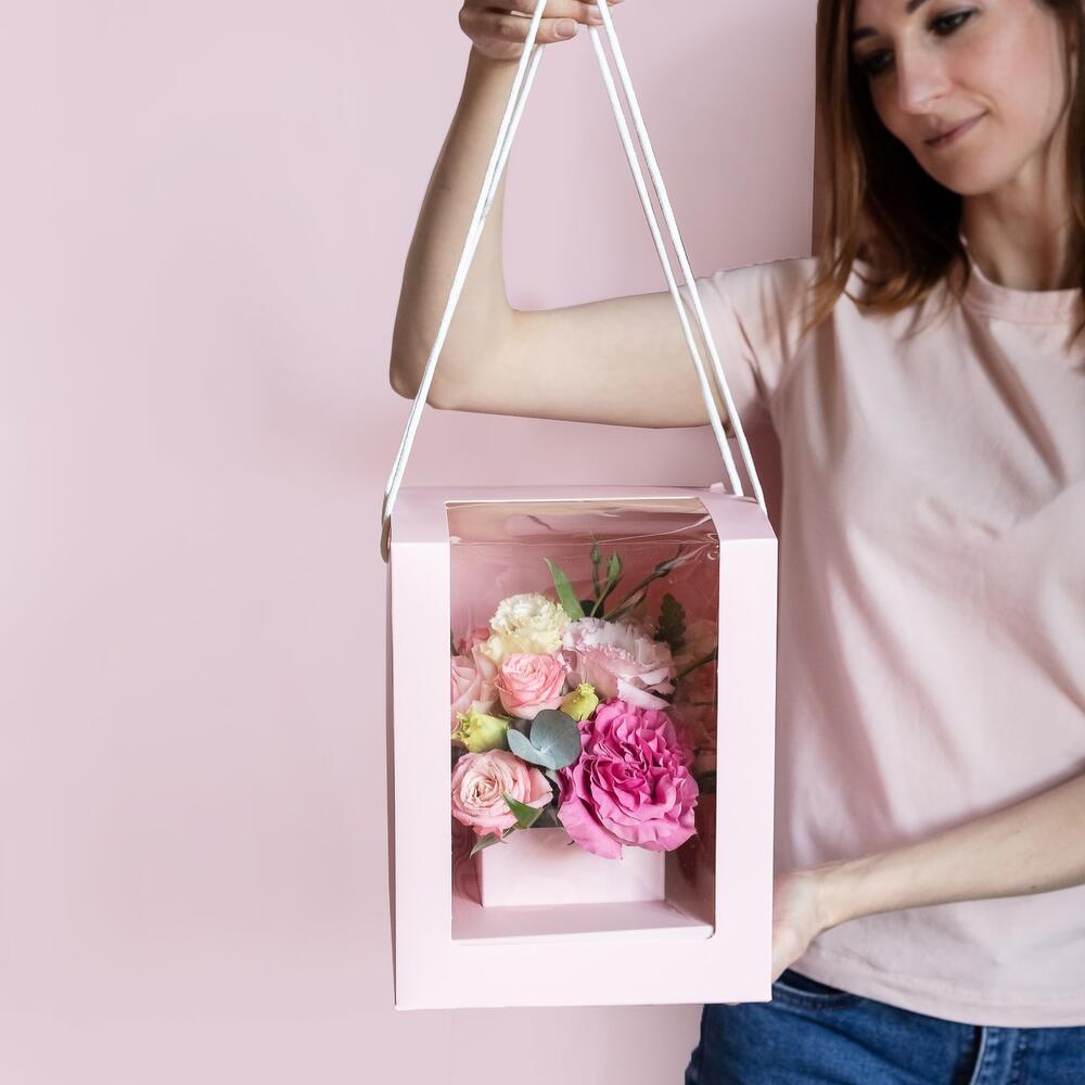 Композиция из свежих цветов в коробке с прозрачным окном.