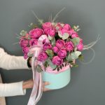 Цветочная композиция в шляпной коробке с розой Misty Bubbles. Охапка нежных пионовидных роз раскрасит этот день яркими красками.* По вашей просьбе, мы подпишем открытку с наилучшими пожеланиями.* Каждый букет цветов (композиция цветов в коробке) упаковывается в прозрачную плёнку и в крафтовый пакет.* Для нежных сортов цветов предусмотрена временная ваза с водой-аквабокс.* К букету прилагается инструкция по уходу и пакетик с подкормкой для продления жизни срезанных цветов в вазе и цветочных композициях на флористической губке.