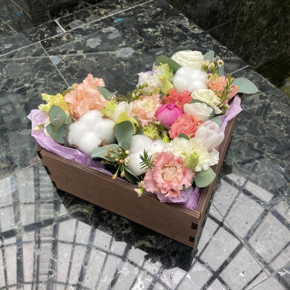 Роза кустовая пионовидная – 1 шт.Лизиантус – 2 шт.Тюльпан – 1 шт.Хлопок – 3 шт.Ваксфлауэр – 1 шт.Эвкалипт – 1 шт.ящик сердце деревянный – 1 шт.