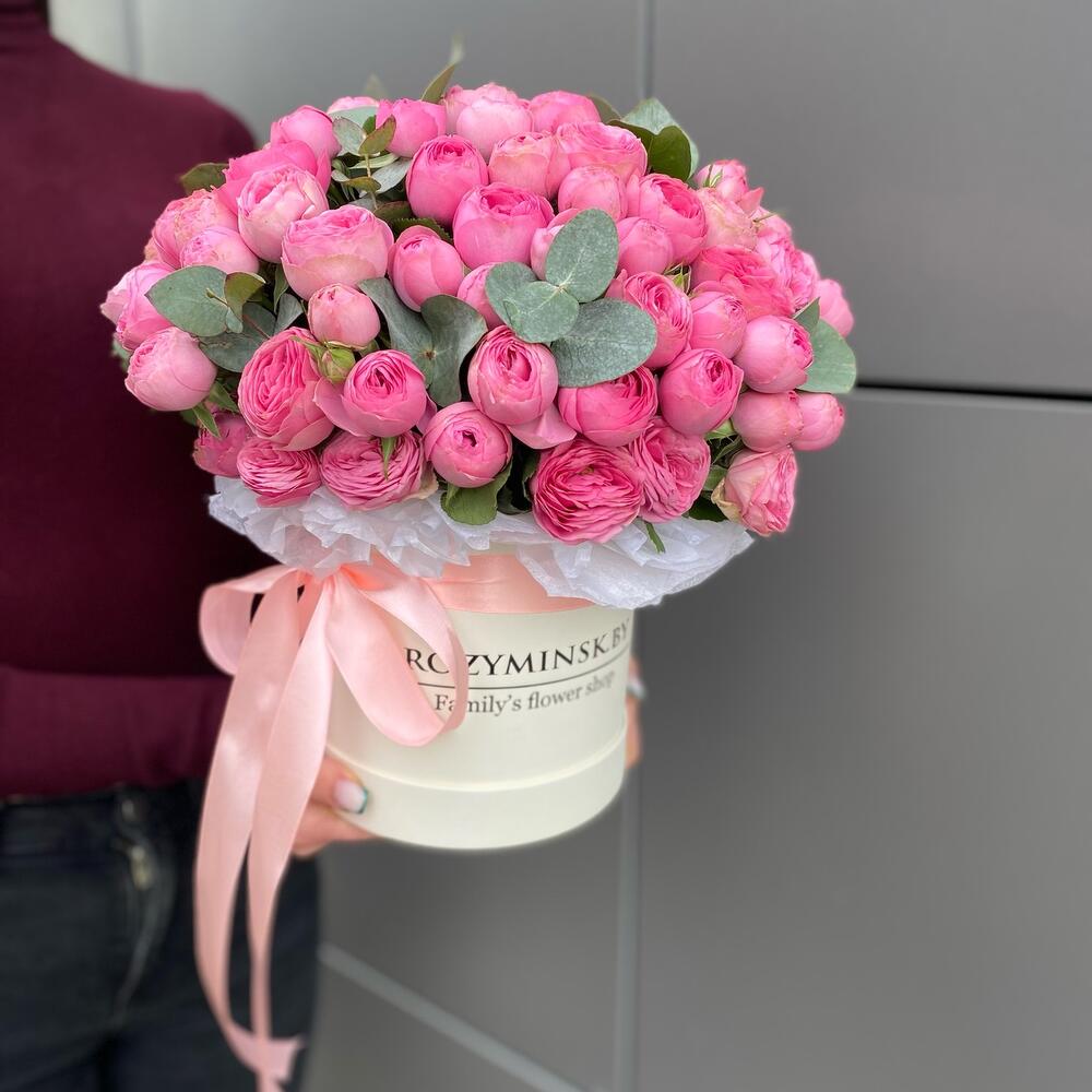 Коробка шляпная – 1 шт. Пионовидная кустовая роза – 11 шт. Губка флористическая – 1 шт.
