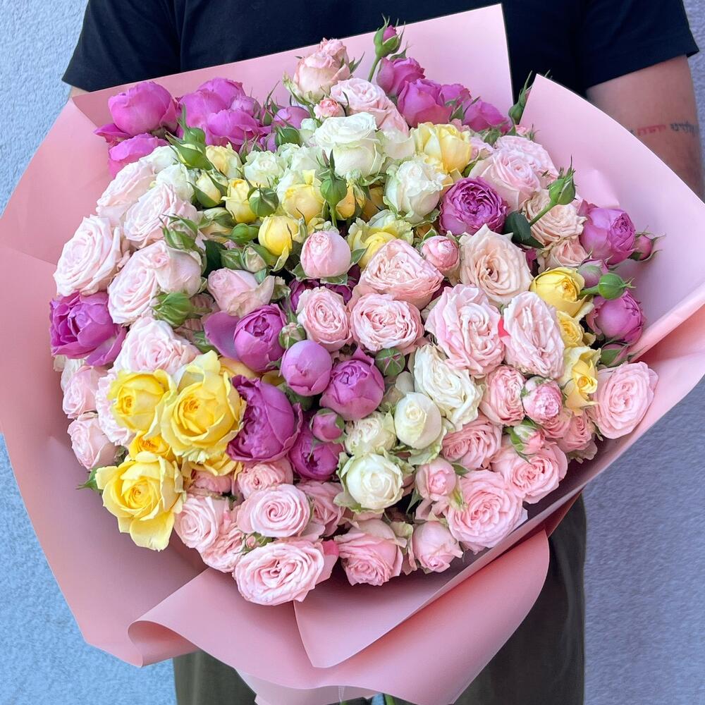 Спрей роза – 61 шт. Подсолнух – 3 шт. Упаковка дизайнерская – 3 шт. Атласная лента – 1 шт. Открыточка с вашими пожеланиями – 1 шт.
