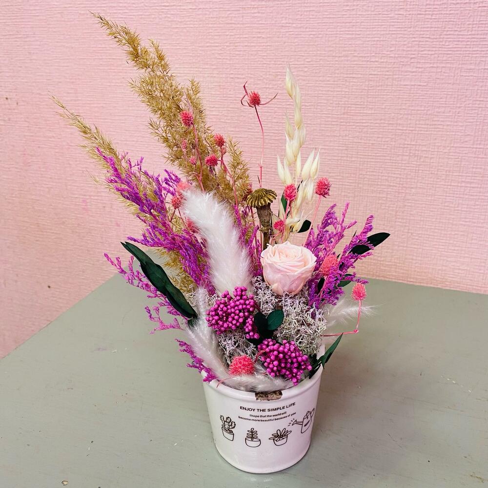 Эвкалипт – 1 шт.Роза стабилизированная – 1 шт.Кашпо керамическое – 1 шт.Мох натуральный – 1 шт.Оазис флористический – 1 шт.пампасная трава – 1 шт.овес сухоцвет – 1 шт.лимониум сухоцвет – 1 шт.эрингиум сухоцвет – 1 шт.озотамнус стабилизированный – 1 шт.