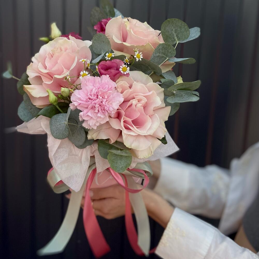 Нежная и воздушная композиция из французских роз, эустомы и диантуса в шляпной коробке